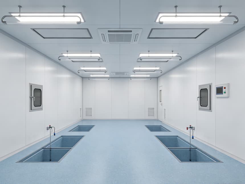電子光學車間內部細節(jié)設計精準匹配行業(yè)核心需求,整體采用淺藍色防靜電潔凈地坪與白色無縫潔凈墻面的組合,風格簡約統(tǒng)一。地面選用3mm厚環(huán)氧防靜電材質,表面經(jīng)啞光工藝處理,既能有效規(guī)避強光反射對光學檢測造成的干擾,又具備10?-10?Ω的穩(wěn)定防靜電性能;同時兼具優(yōu)異的耐磨特性,可耐受酒精等常用清潔劑擦拭,墻角均采用50mm圓弧設計,從根源上消除積塵死角,筑牢潔凈基礎。