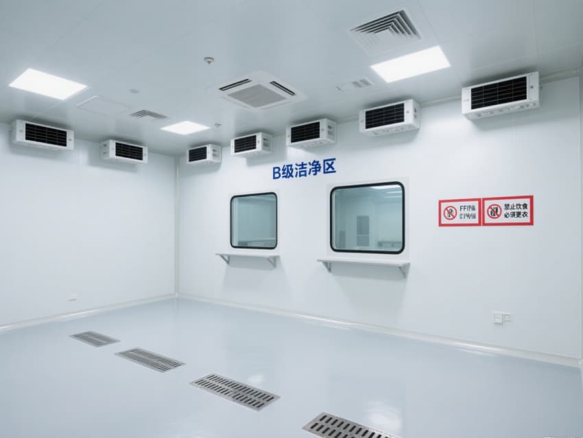 頂部嵌入式高效送風口形成垂直層流,配合側下回風系統實現每小時15-25次空氣置換,恒溫恒濕系統精準控制溫度(18-26℃)、濕度(45-65%)。不銹鋼潔凈門窗與傳遞窗采用高氣密性密封結構,嵌入式LED潔凈燈提供≥300lux均勻照明,全方位營造安全、精準的生物制藥生產基礎環境。