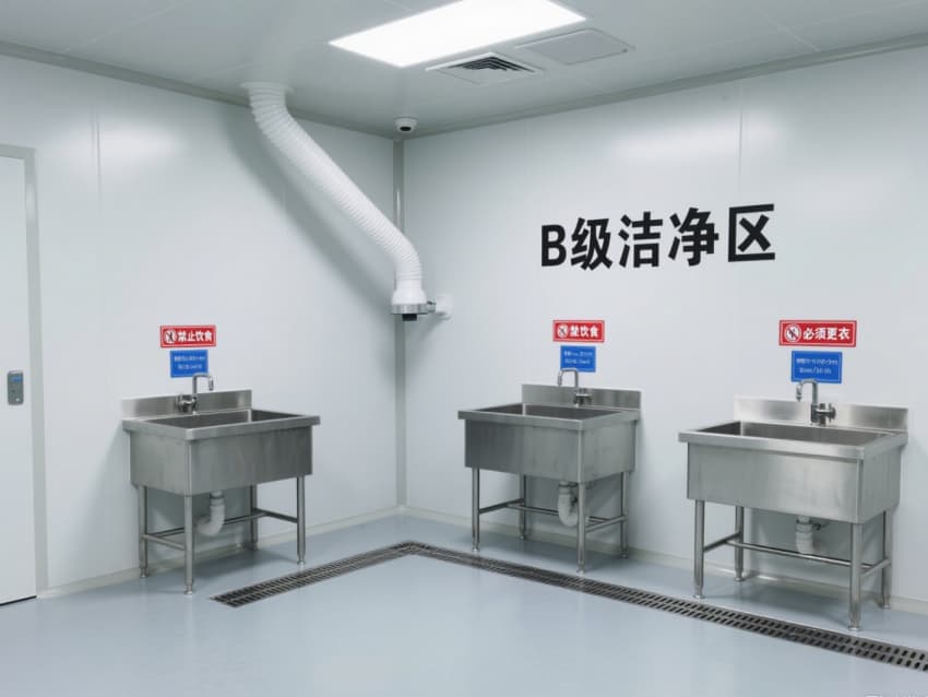 車間嚴格遵循萬級潔凈標準,每立方米空氣中≥0.5μm微粒數≤35.2萬個、菌落數≤10個。白色抗菌彩鋼板搭建的墻體與吊頂,具備抗菌、耐腐蝕、易消毒特性,墻面與地面的圓弧過渡設計徹底消除衛生死角;淺灰防靜電環氧地坪則通過防靜電處理,避免靜電干擾生物活性物質。?