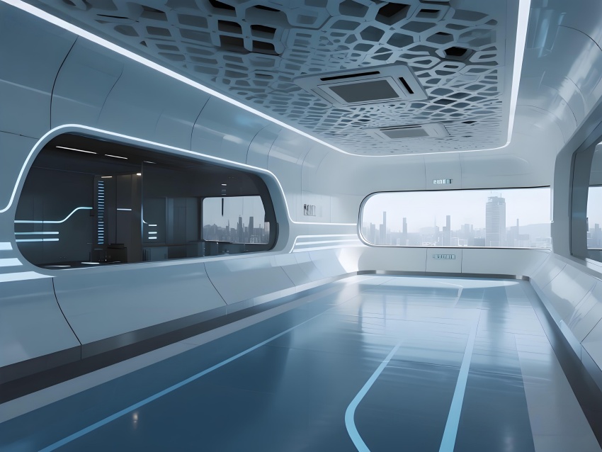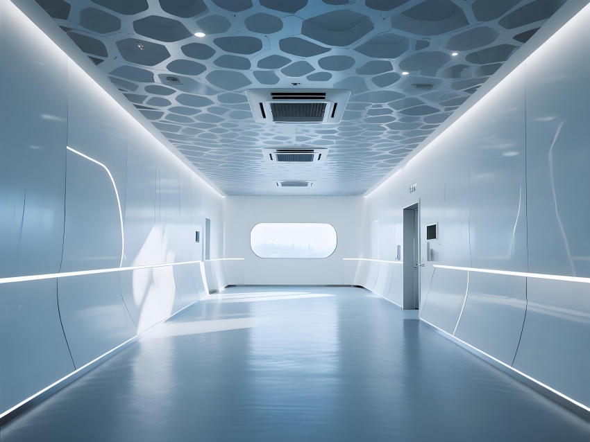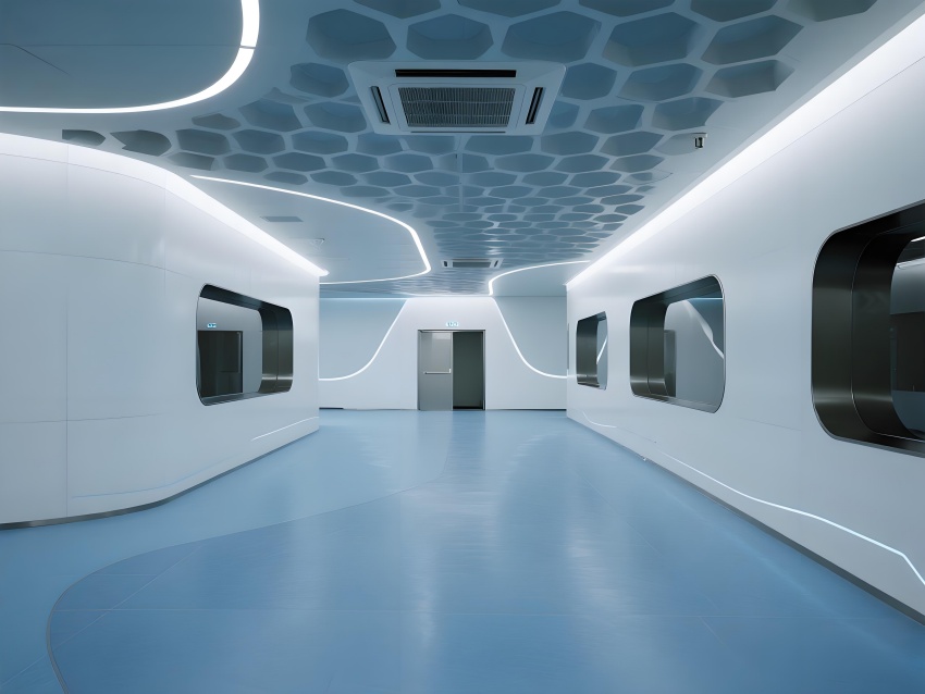 本車間空間以冰川藍與鈦白為主色調,弧形墻角與無縫地坪構成流暢的潔凈界面,頂部蜂窩狀FFU陣列形成科技感天花肌理。灌裝區透明亞克力防護罩展示自動化生產線運作,配合層流工作臺的紅色氣流可視化設計,強化無菌核心概念。功能模塊通過地面灰色導視帶串聯,設備區的鏡面不銹鋼與控制面板的藍色背光形成冷調光效。玻璃觀察窗嵌入電子壓差計,走廊的漸變光環境引導系統在滿足GMP動態監測要求的同時,營造出未來實驗室般的專業氛圍,緩解員工長時間密閉作業的疲勞感。