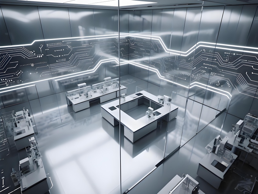 本實驗室采用"量子科技美學"設計,將納米尺度的精密感轉化為空間敘事。主實驗區以鏡面銀與深空灰為基調,半透明防輻射玻璃墻體內嵌電路板紋理光帶,象征微觀世界的電子軌跡。百級潔凈區的金色氣流箭頭與千級區的藍色光暈形成能級躍遷般的視覺分級,CVD設備艙的蜂窩狀散熱孔與懸浮式控制面板構成未來工廠意象。地面導光纖維模擬分子結構網絡,天花板動態粒子監測屏以數據流形式投射納米顆粒分布。通過冷調LED與設備熒光的層次照明,在滿足EMI屏蔽與化學防護需求的同時,創造出如同操作量子領域的沉浸式科研環境,透明氣閘門上的全息警示標志進一步強化尖端材料研究的科技儀式感。