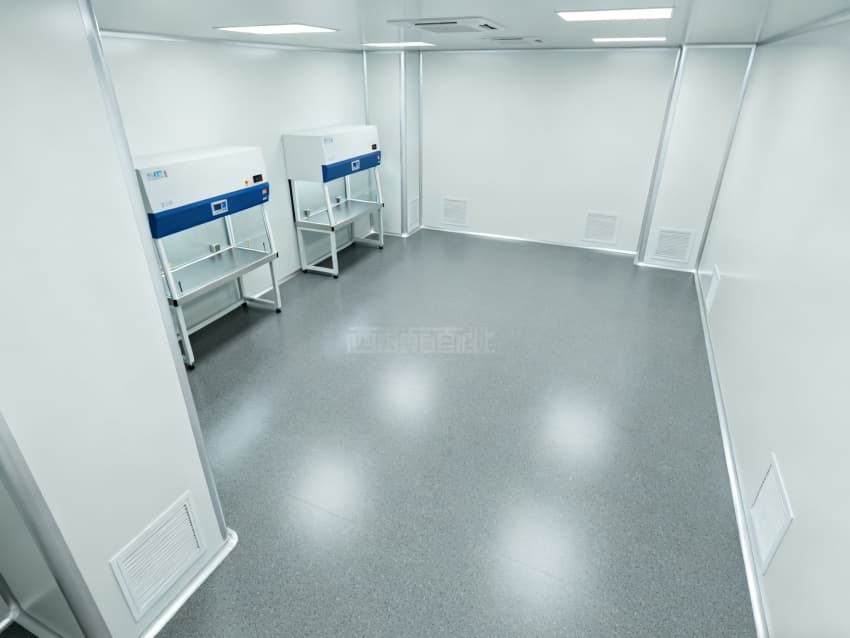 設計在環境適配性上針對性突出:地面采用灰色耐濕熱環氧自流平材質,其特殊配方經121℃高溫滅菌循環測試后硬度無衰減,表面粗糙度Ra≤0.8μm,配合無縫拼接工藝形成連續抗菌屏障,有效阻斷芽孢桿菌等頑固微生物的滋生路徑;四周白色抗菌墻壁選用食品級納米涂層,該涂層經第三方檢測機構驗證,對金黃色葡萄球菌抑菌率達99.9%,配合R≥50mm的圓弧墻角與全密封模塊化吊頂,徹底消除傳統直角結構的積塵隱患。車間頂部集成三級過濾生物安全型層流系統,通過初效、中效、高效過濾器的梯度攔截,配合FFU風機過濾單元實現垂直單向流,可穩定維持ISO7級(萬級)潔凈度,局部配置百級層流罩形成隔離操作區,確保關鍵工序在無菌環境下進行。此外,墻面還預埋了智能溫濕度傳感器陣列,通過物聯網系統實時監控并調節溫濕度參數,為發酵菌種提供最適宜的生長環境。
