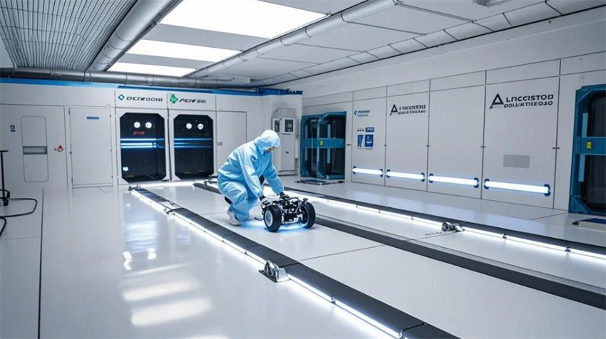 機械人研發實驗室,未來科技風格。實驗室分為研發區、測試區、裝配區和辦公區。研發區占50%,測試區占30%,裝配區占10%,辦公區占10%。研發區:防靜電環氧地坪(淺灰色),白色彩鋼板墻面和天花板,頂部高效過濾器(HEPA),不銹鋼工作臺,機械人原型和3D打印機排列整齊。測試區:機械人測試平臺,地面為防靜電PVC地板(淺色)。裝配區:工具架整齊,機械人部件分類存放。辦公區:玻璃隔斷,現代簡約辦公桌。整體色彩:白色、淺灰色、科技藍點綴。