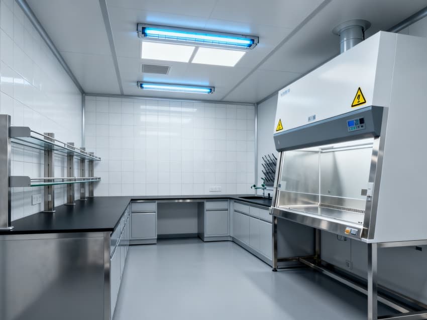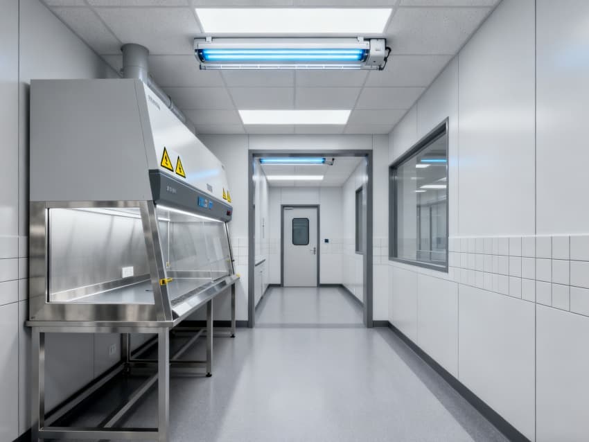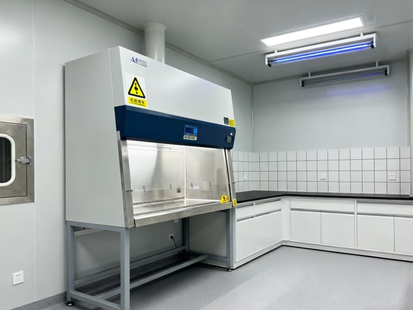 圍護(hù)結(jié)構(gòu)選用304不銹鋼抗菌墻板與無縫PVC地面,轉(zhuǎn)角圓弧處理無衛(wèi)生死角,配套紫外消毒系統(tǒng)與恒溫恒濕控制(22±1℃,50±5%RH),全面滿足微生物研究的無菌環(huán)境要求。