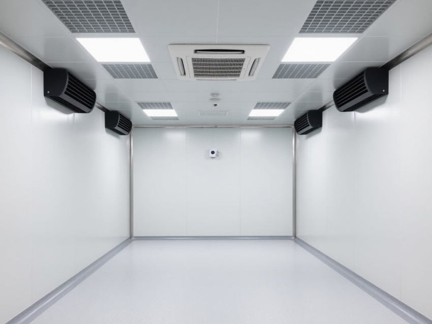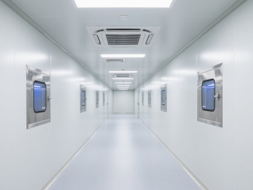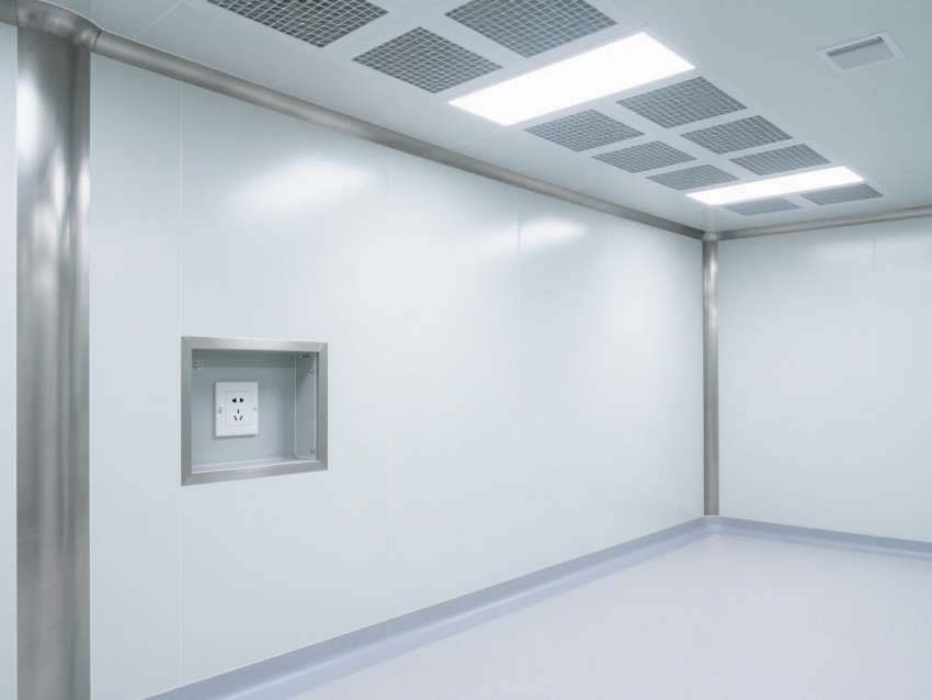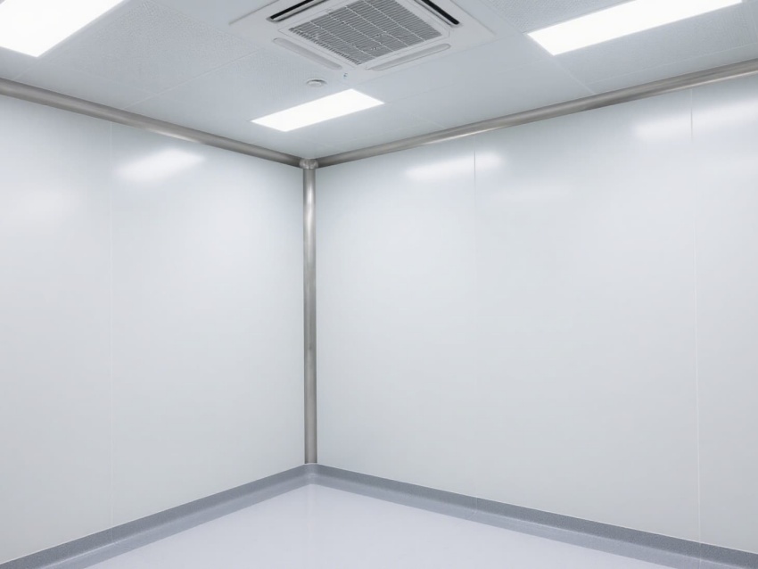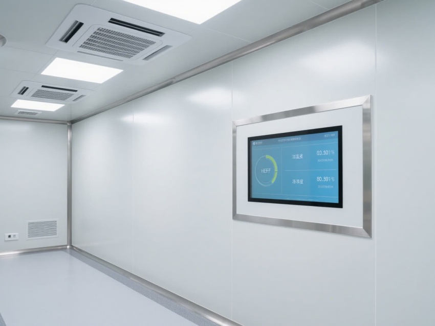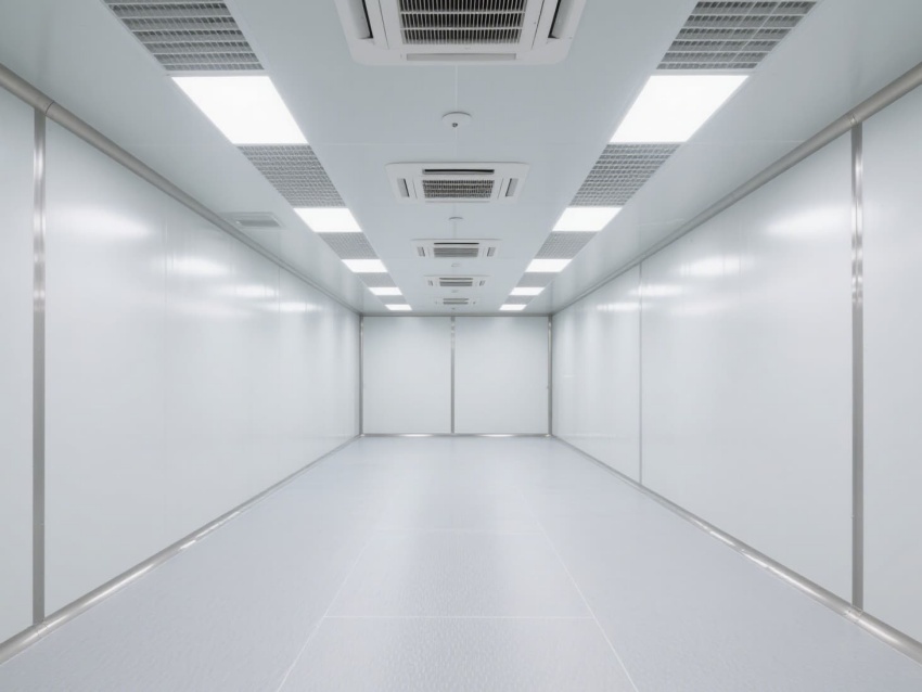 車間以白色抗菌彩鋼板為主體建材,搭配淺灰防靜電地坪,墻面與地面的圓弧過(guò)渡設(shè)計(jì)消除衛(wèi)生死角,便于徹底清潔消毒。頂部嵌入式高效送風(fēng)口形成垂直層流,配合側(cè)下回風(fēng)系統(tǒng),實(shí)現(xiàn)每小時(shí)15-25次的空氣置換,持續(xù)維持潔凈正壓。?
