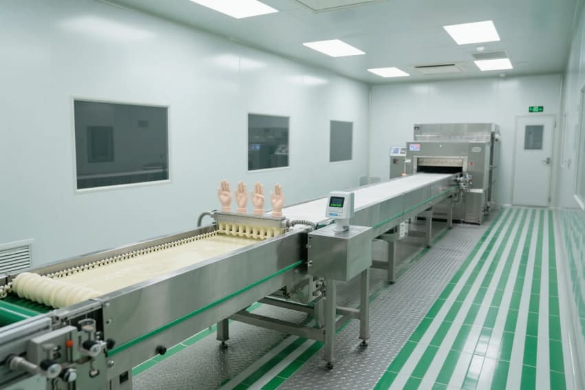 ?本醫用手套車間采用"原料-成型-硫化-包裝"全封閉流水線設計,核心浸漬區維持Class100,000級潔凈環境,配備22米恒溫鏈式烘道確保硫化均勻性。原料處理采用氮氣保護系統防止乳膠變質,智能化浸漬槽通過PID控制實現膜厚公差±0.01mm。特色設計包括:1)手模自動檢測系統(AI識別缺損)2)熱能回收裝置(節能30%)3)雙通道EO滅菌(F0≥15)。安全體系實現:1)氨氣濃度實時報警2)應急電源0.5秒切換3)廢水預處理(pH6-8)。質檢區配備全自動針孔檢測儀與生物負載測試設備,確保產品符合FDA510(k)標準。車間通過模塊化布局可實現日產50萬副醫用檢查手套,材料利用率達98.5%。