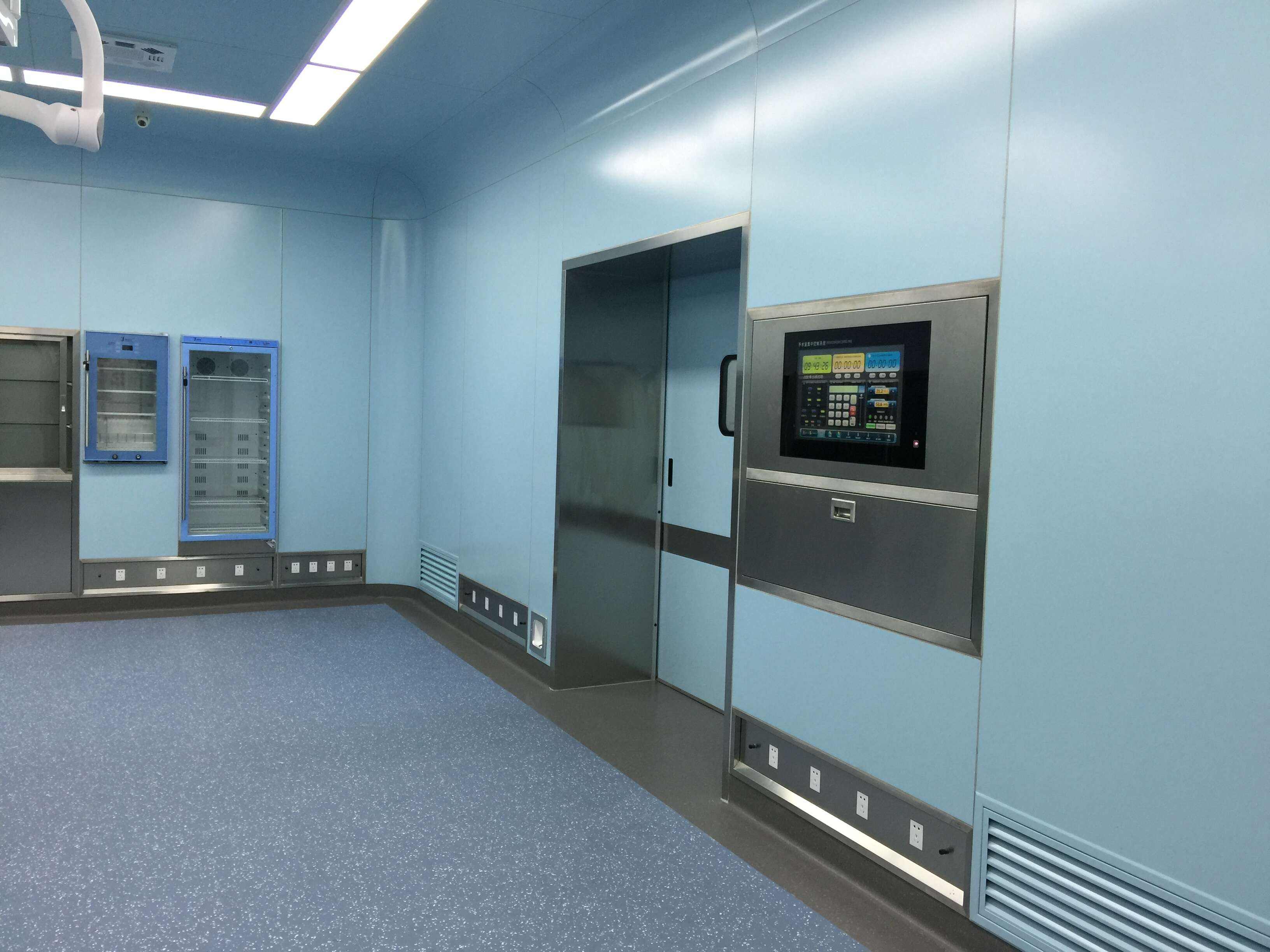 醫療整形美容院層流手術室三間,其中一間千級手術室凈化系統,兩間萬級潔凈手術室,層流手術室建筑施工面積260㎡(含相應輔助用房功能間,輔助用房為十萬級凈化),板材采用藍色玻鎂潔凈板,地面搭配進口PVC,具有抗碘伏、耐磨、防滑、易清洗功能;凈化機組采用領先技術的醫凈恒溫恒濕空調,搭配PLC控制系統、高端觸摸屏控制器,具有自動加濕除濕、自動調節溫度、故障報警功能;已取得第三方檢測公司的檢測報告;手術室潔凈走廊,搭配藍色潔凈板與進口品質pvc地板;墻體安裝不銹鋼防撞帶,有效保障了推手術病人的過程中發生的墻體擦掛;醫用自動門定制同色,配備光感應防夾功能、內外腳踏感應功能,電機采用進口機芯,啟動聲音低。
